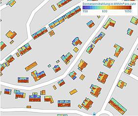 Das Kataster zeigt sowohl die grundsätzliche Eignung der Gebäude, als auch die Sonneneinstrahlung auf den Dachflächen an. Und zwar recht detailliert! Hausbesitzer haben so wichtige Grundlagendaten per Internet sofort zur Hand. Das Kataster macht sogar Vorschläge, welche Photovoltaik-Technik angewendet werden kann und errechnet überschlägig eine Kosten-Nutzen Analyse.